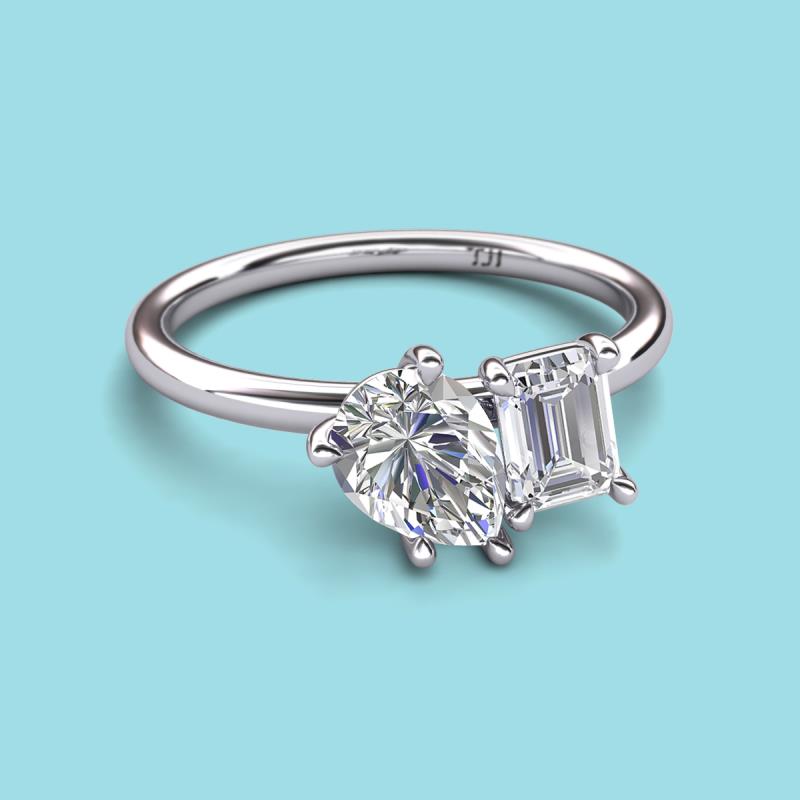 Find a beautiful symbol of everlasting love, with our new collection of duo two-stone ring. A pair of Pear Shape GIA Certified Diamond shimmering alongside of a luminous Emerald Shape White Sapphire crafted beautifully is all set to represent two of you together.