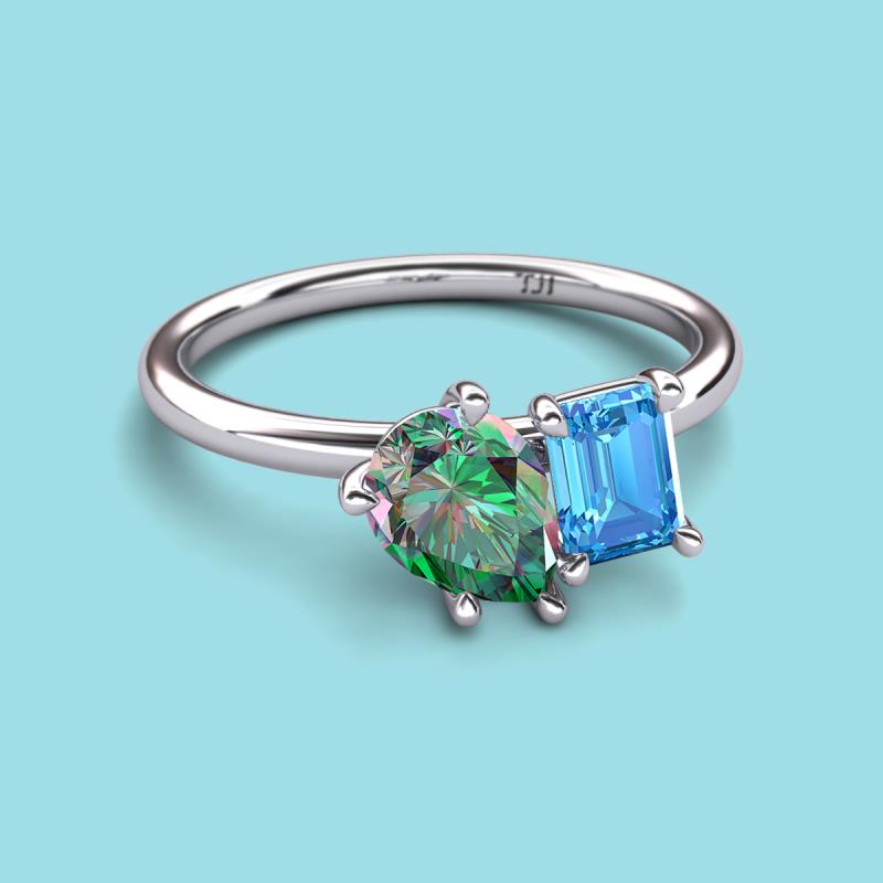 Find a beautiful symbol of everlasting love, with our new collection of duo two-stone ring. A pair of Pear Shape Lab Created Alexandrite shimmering alongside of a luminous Emerald Shape Blue Topaz crafted beautifully is all set to represent two of you together.
