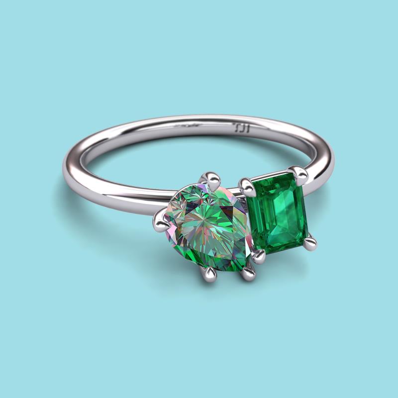 Find a beautiful symbol of everlasting love, with our new collection of duo two-stone ring. A pair of Pear Shape Lab Created Alexandrite shimmering alongside of a luminous Emerald Shape Emerald crafted beautifully is all set to represent two of you together.