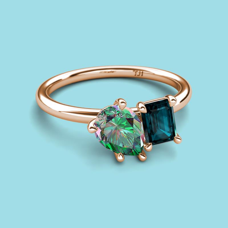 Find a beautiful symbol of everlasting love, with our new collection of duo two-stone ring. A pair of Pear Shape Lab Created Alexandrite shimmering alongside of a luminous Emerald Shape London Blue Topaz crafted beautifully is all set to represent two of you together.