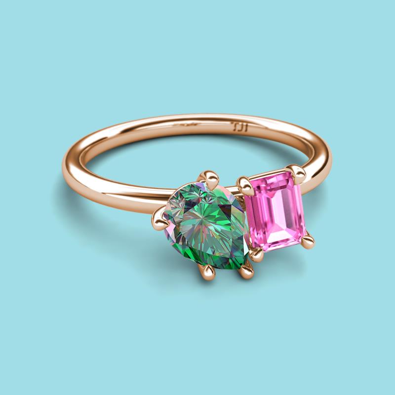 Find a beautiful symbol of everlasting love, with our new collection of duo two-stone ring. A pair of Pear Shape Lab Created Alexandrite shimmering alongside of a luminous Emerald Shape Pink Sapphire crafted beautifully is all set to represent two of you together.