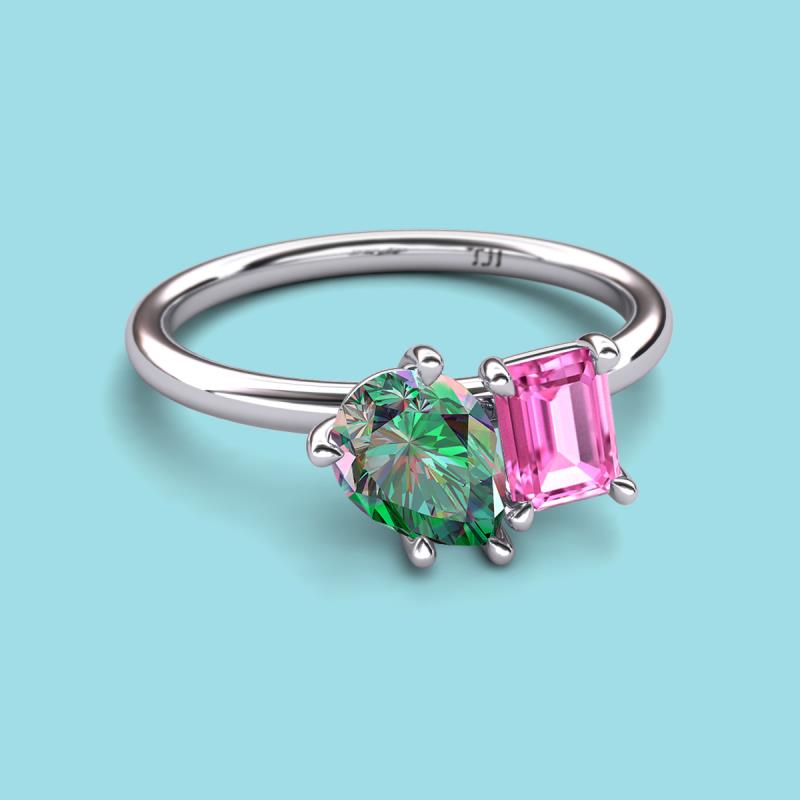 Find a beautiful symbol of everlasting love, with our new collection of duo two-stone ring. A pair of Pear Shape Lab Created Alexandrite shimmering alongside of a luminous Emerald Shape Pink Sapphire crafted beautifully is all set to represent two of you together.