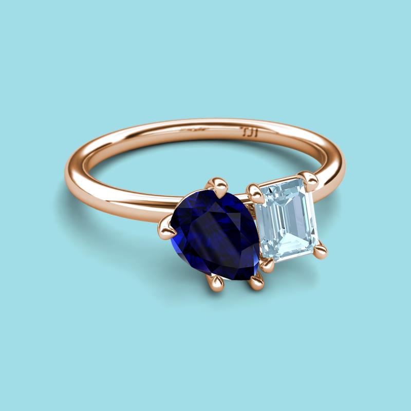 Find a beautiful symbol of everlasting love, with our new collection of duo two-stone ring. A pair of Pear Shape Lab Created Blue Sapphire shimmering alongside of a luminous Emerald Shape Aquamarine crafted beautifully is all set to represent two of you together.