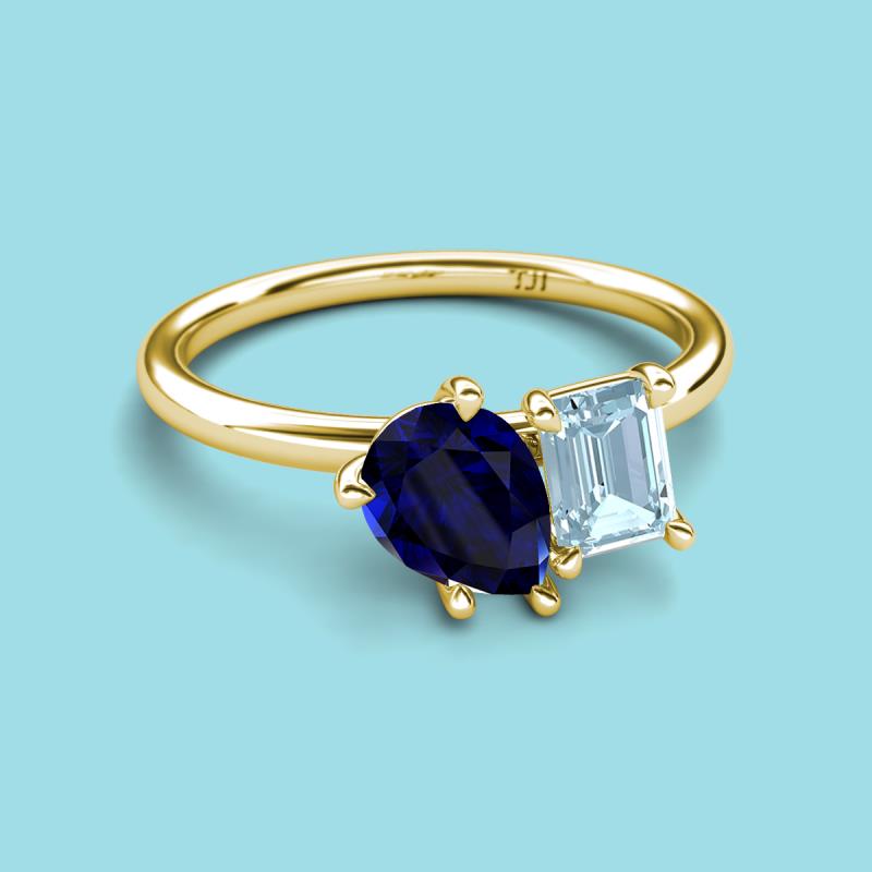 Find a beautiful symbol of everlasting love, with our new collection of duo two-stone ring. A pair of Pear Shape Lab Created Blue Sapphire shimmering alongside of a luminous Emerald Shape Aquamarine crafted beautifully is all set to represent two of you together.