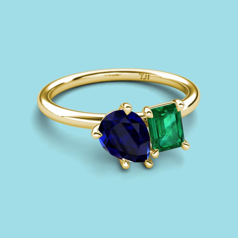 Find a beautiful symbol of everlasting love, with our new collection of duo two-stone ring. A pair of Pear Shape Lab Created Blue Sapphire shimmering alongside of a luminous Emerald Shape Emerald crafted beautifully is all set to represent two of you together.