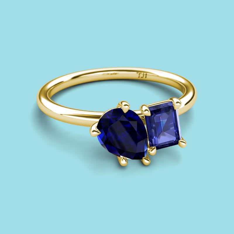 Find a beautiful symbol of everlasting love, with our new collection of duo two-stone ring. A pair of Pear Shape Lab Created Blue Sapphire shimmering alongside of a luminous Emerald Shape Iolite crafted beautifully is all set to represent two of you together.
