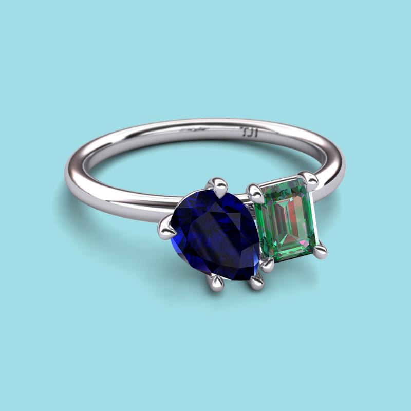 Find a beautiful symbol of everlasting love, with our new collection of duo two-stone ring. A pair of Pear Shape Lab Created Blue Sapphire shimmering alongside of a luminous Emerald Shape Lab Created Alexandrite crafted beautifully is all set to represent two of you together.