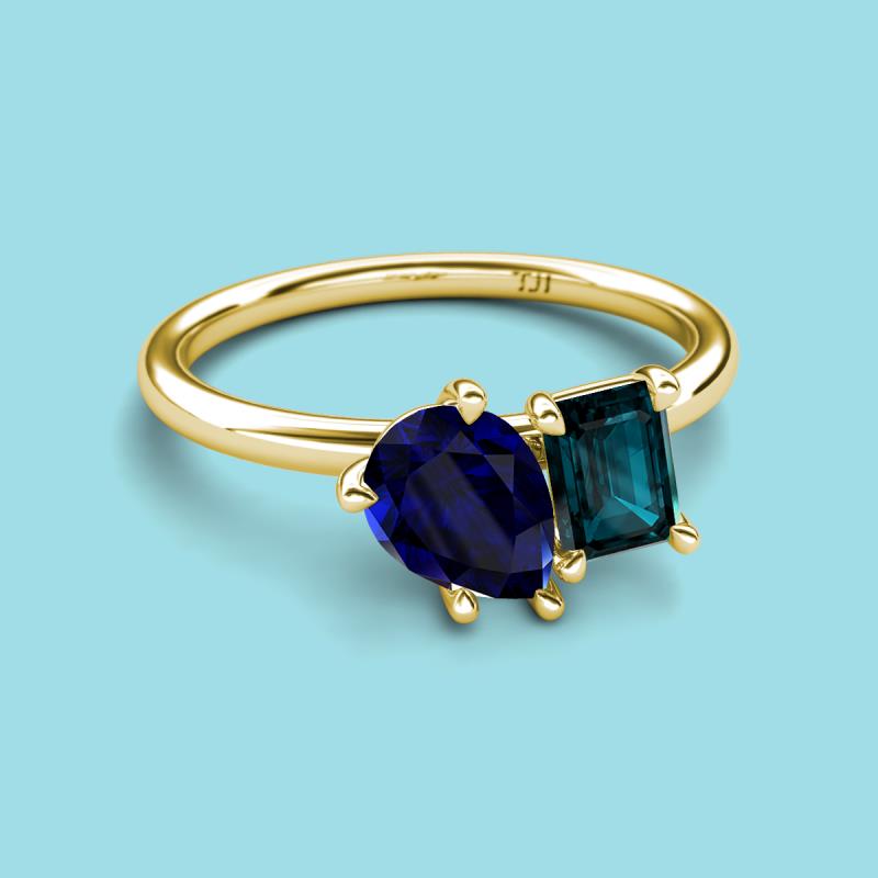 Find a beautiful symbol of everlasting love, with our new collection of duo two-stone ring. A pair of Pear Shape Lab Created Blue Sapphire shimmering alongside of a luminous Emerald Shape London Blue Topaz crafted beautifully is all set to represent two of you together.