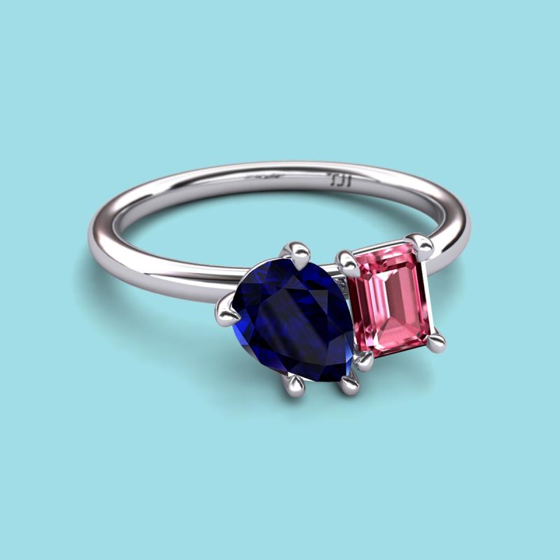Find a beautiful symbol of everlasting love, with our new collection of duo two-stone ring. A pair of Pear Shape Lab Created Blue Sapphire shimmering alongside of a luminous Emerald Shape Pink Tourmaline crafted beautifully is all set to represent two of you together.