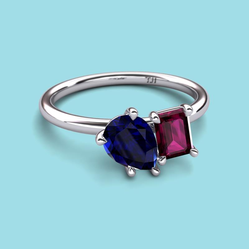 Find a beautiful symbol of everlasting love, with our new collection of duo two-stone ring. A pair of Pear Shape Lab Created Blue Sapphire shimmering alongside of a luminous Emerald Shape Rhodolite Garnet crafted beautifully is all set to represent two of you together.
