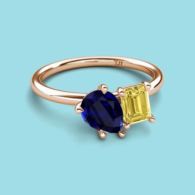 Find a beautiful symbol of everlasting love, with our new collection of duo two-stone ring. A pair of Pear Shape Lab Created Blue Sapphire shimmering alongside of a luminous Emerald Shape Yellow Sapphire crafted beautifully is all set to represent two of you together.