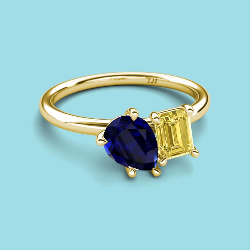 Find a beautiful symbol of everlasting love, with our new collection of duo two-stone ring. A pair of Pear Shape Lab Created Blue Sapphire shimmering alongside of a luminous Emerald Shape Yellow Sapphire crafted beautifully is all set to represent two of you together.