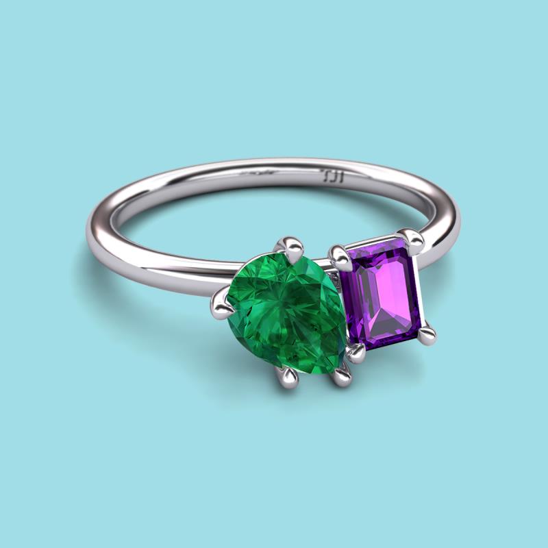 Find a beautiful symbol of everlasting love, with our new collection of duo two-stone ring. A pair of Pear Shape Lab Created Emerald shimmering alongside of a luminous Emerald Shape Amethyst crafted beautifully is all set to represent two of you together.