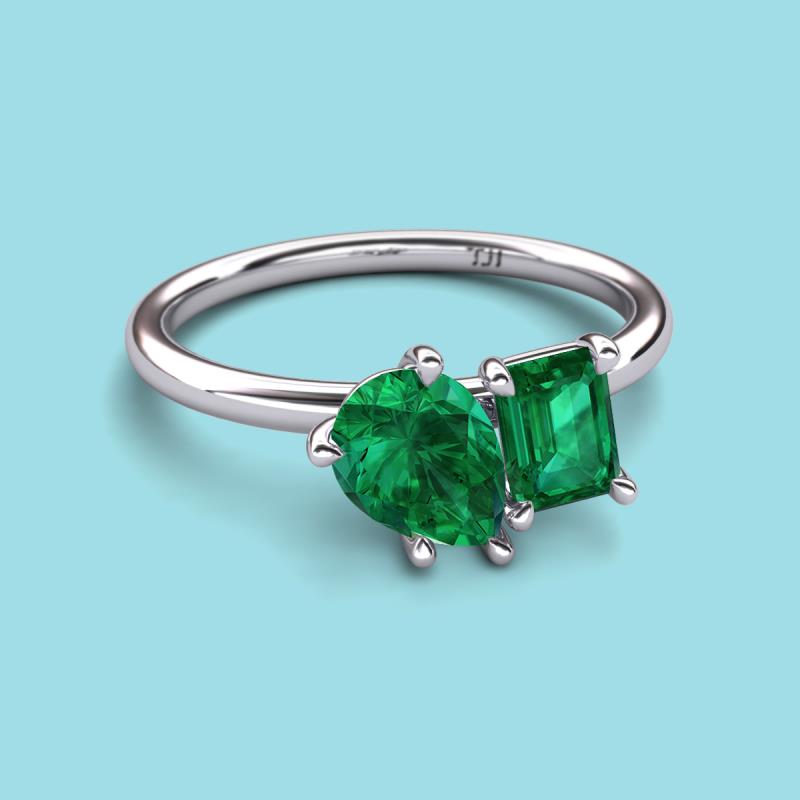 Find a beautiful symbol of everlasting love, with our new collection of duo two-stone ring. A pair of Pear Shape Lab Created Emerald shimmering alongside of a luminous Emerald Shape Emerald crafted beautifully is all set to represent two of you together.