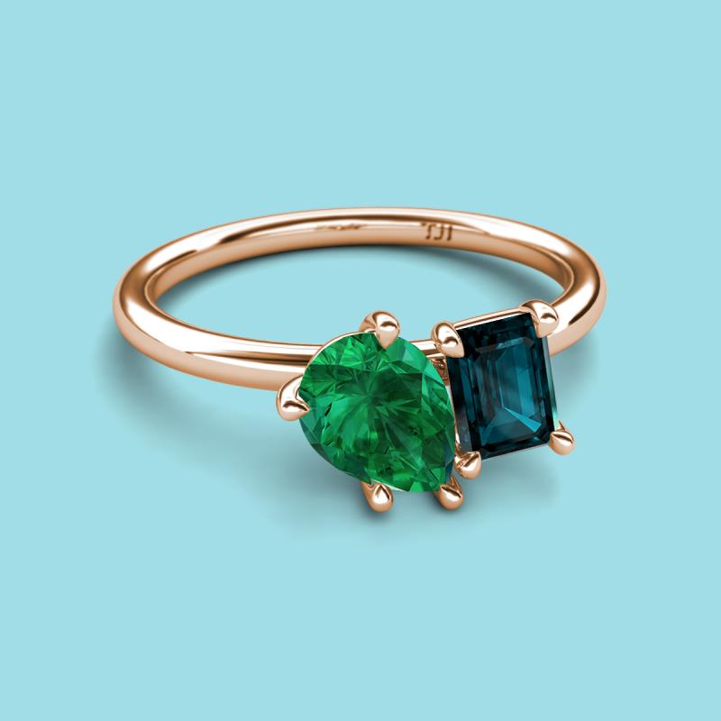 Find a beautiful symbol of everlasting love, with our new collection of duo two-stone ring. A pair of Pear Shape Lab Created Emerald shimmering alongside of a luminous Emerald Shape London Blue Topaz crafted beautifully is all set to represent two of you together.