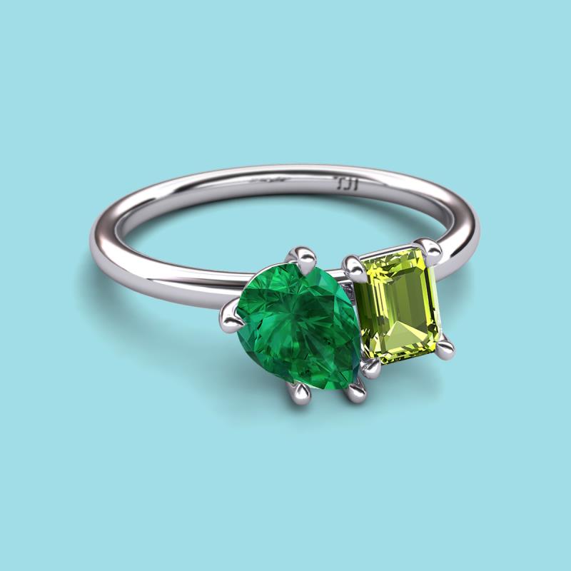 Find a beautiful symbol of everlasting love, with our new collection of duo two-stone ring. A pair of Pear Shape Lab Created Emerald shimmering alongside of a luminous Emerald Shape Peridot crafted beautifully is all set to represent two of you together.