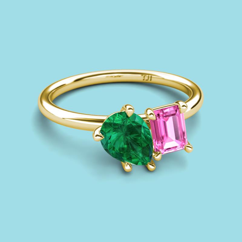 Find a beautiful symbol of everlasting love, with our new collection of duo two-stone ring. A pair of Pear Shape Lab Created Emerald shimmering alongside of a luminous Emerald Shape Pink Sapphire crafted beautifully is all set to represent two of you together.
