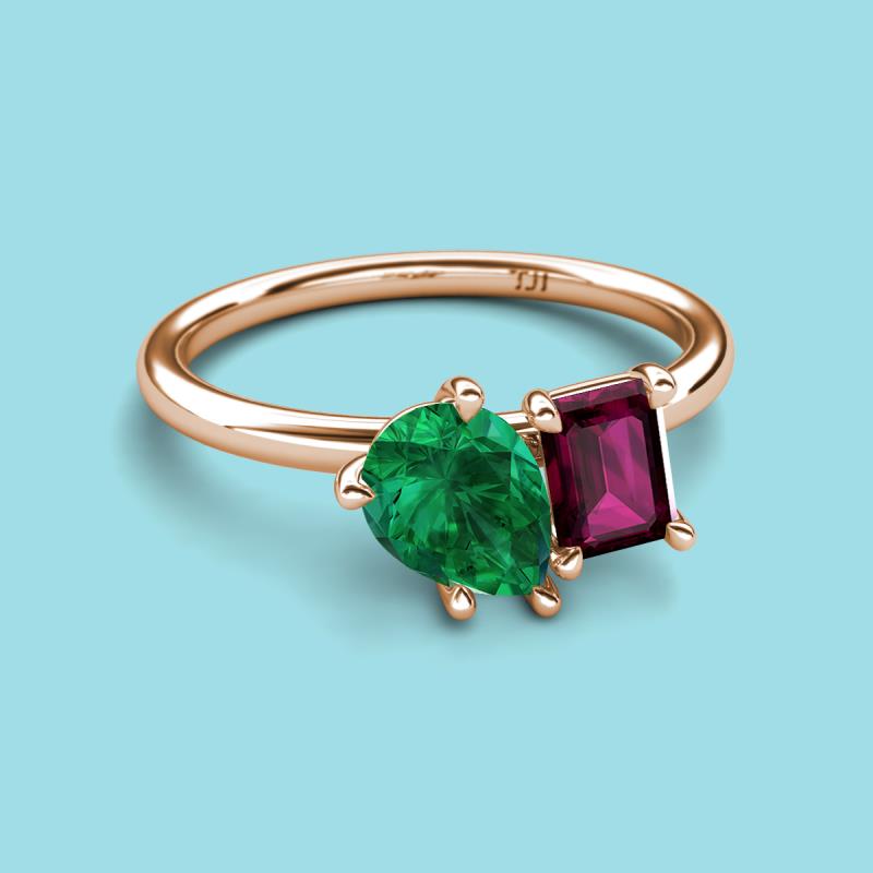 Find a beautiful symbol of everlasting love, with our new collection of duo two-stone ring. A pair of Pear Shape Lab Created Emerald shimmering alongside of a luminous Emerald Shape Rhodolite Garnet crafted beautifully is all set to represent two of you together.