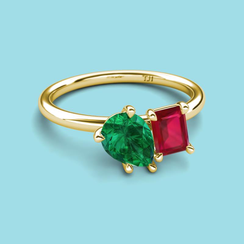 Find a beautiful symbol of everlasting love, with our new collection of duo two-stone ring. A pair of Pear Shape Lab Created Emerald shimmering alongside of a luminous Emerald Shape Ruby crafted beautifully is all set to represent two of you together.