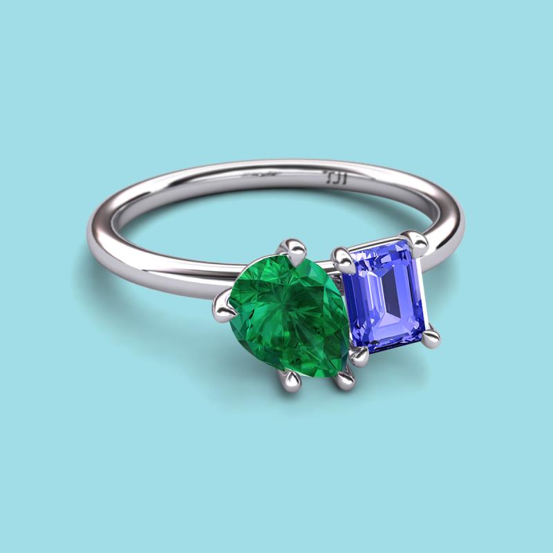 Find a beautiful symbol of everlasting love, with our new collection of duo two-stone ring. A pair of Pear Shape Lab Created Emerald shimmering alongside of a luminous Emerald Shape Tanzanite crafted beautifully is all set to represent two of you together.