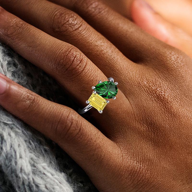 Find a beautiful symbol of everlasting love, with our new collection of duo two-stone ring. A pair of Pear Shape Lab Created Emerald shimmering alongside of a luminous Emerald Shape Yellow Sapphire crafted beautifully is all set to represent two of you together.
