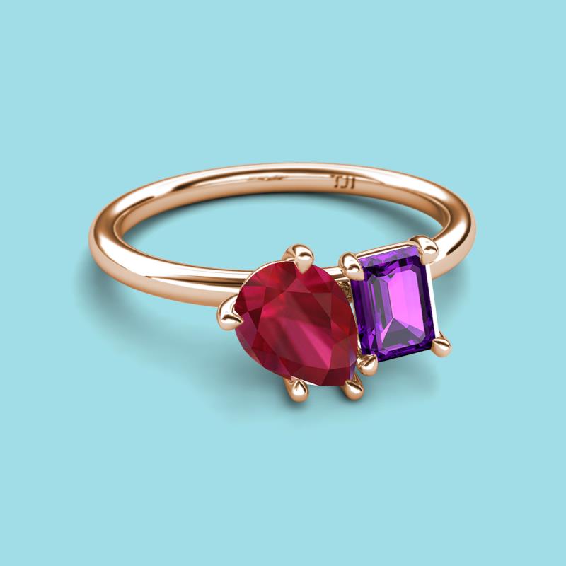 Find a beautiful symbol of everlasting love, with our new collection of duo two-stone ring. A pair of Pear Shape Created Ruby shimmering alongside of a luminous Emerald Shape Amethyst crafted beautifully is all set to represent two of you together.