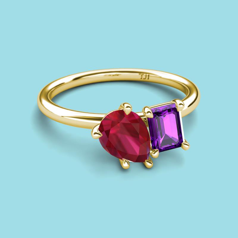 Find a beautiful symbol of everlasting love, with our new collection of duo two-stone ring. A pair of Pear Shape Created Ruby shimmering alongside of a luminous Emerald Shape Amethyst crafted beautifully is all set to represent two of you together.