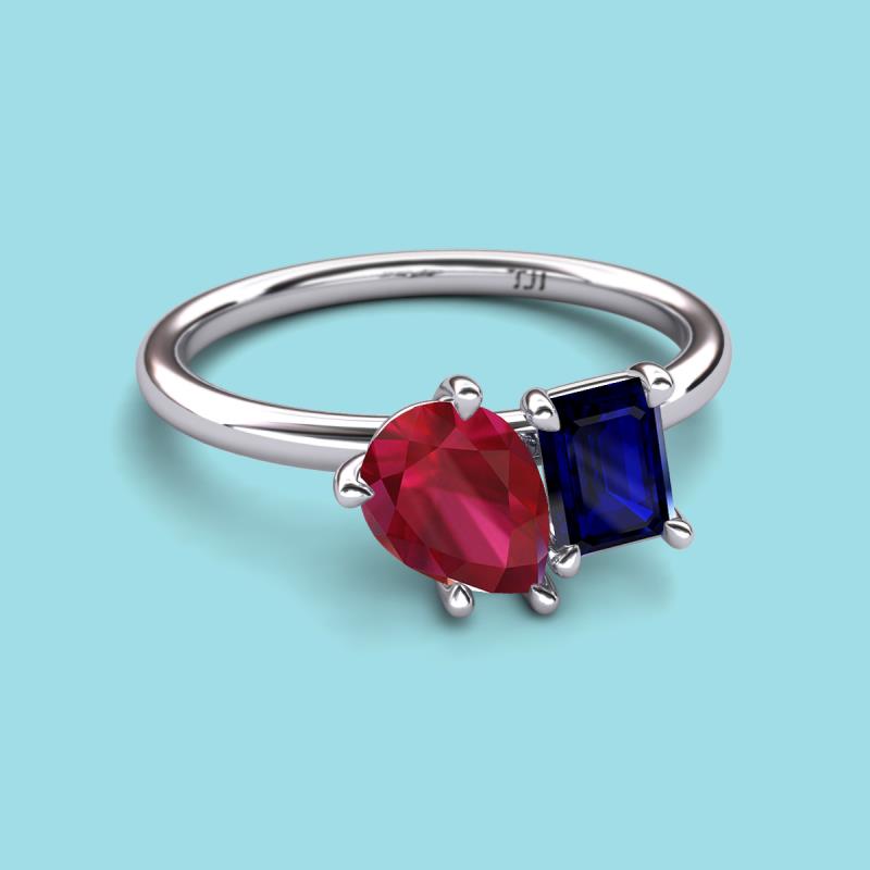 Find a beautiful symbol of everlasting love, with our new collection of duo two-stone ring. A pair of Pear Shape Created Ruby shimmering alongside of a luminous Emerald Shape Blue Sapphire crafted beautifully is all set to represent two of you together.