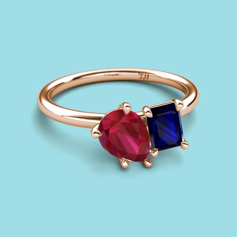 Find a beautiful symbol of everlasting love, with our new collection of duo two-stone ring. A pair of Pear Shape Created Ruby shimmering alongside of a luminous Emerald Shape Blue Sapphire crafted beautifully is all set to represent two of you together.