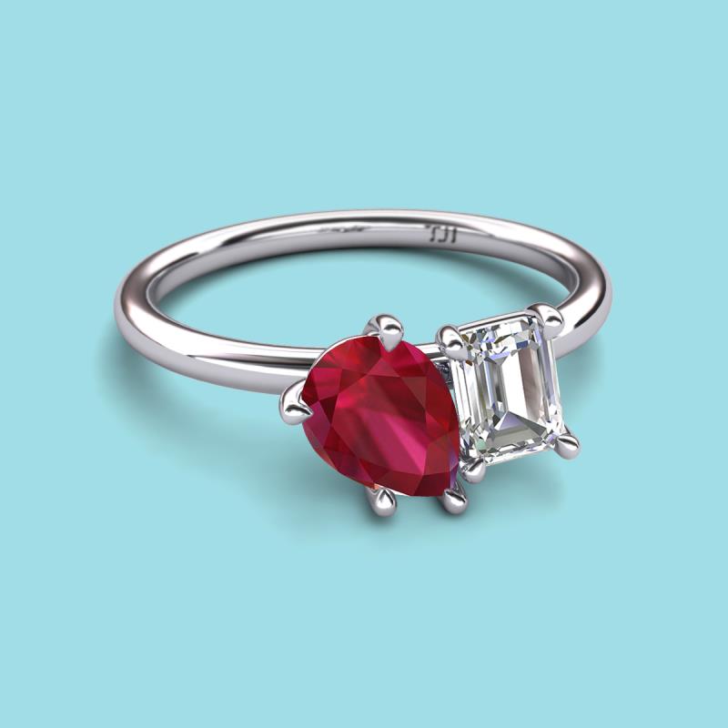 Find a beautiful symbol of everlasting love, with our new collection of duo two-stone ring. A pair of Pear Shape Lab Created Ruby shimmering alongside of a luminous Emerald Shape GIA Certified Diamond crafted beautifully is all set to represent two of you together.