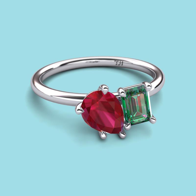 Find a beautiful symbol of everlasting love, with our new collection of duo two-stone ring. A pair of Pear Shape Created Ruby shimmering alongside of a luminous Emerald Shape Lab Created Alexandrite crafted beautifully is all set to represent two of you together.