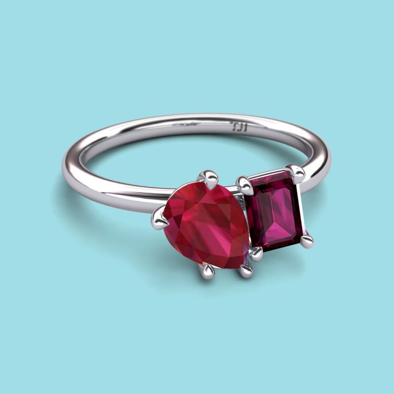 Find a beautiful symbol of everlasting love, with our new collection of duo two-stone ring. A pair of Pear Shape Created Ruby shimmering alongside of a luminous Emerald Shape Rhodolite Garnet crafted beautifully is all set to represent two of you together.
