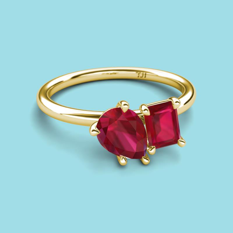 Find a beautiful symbol of everlasting love, with our new collection of duo two-stone ring. A pair of Pear Shape Created Ruby shimmering alongside of a luminous Emerald Shape Ruby crafted beautifully is all set to represent two of you together.