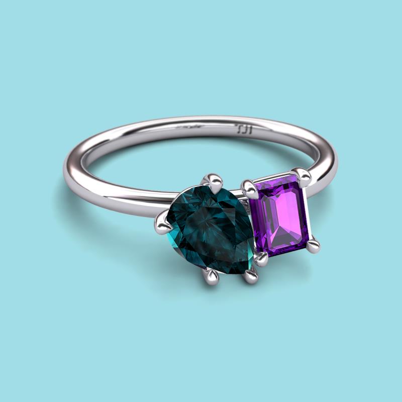 Find a beautiful symbol of everlasting love, with our new collection of duo two-stone ring. A pair of Pear Shape London Blue Topaz shimmering alongside of a luminous Emerald Shape Amethyst crafted beautifully is all set to represent two of you together.