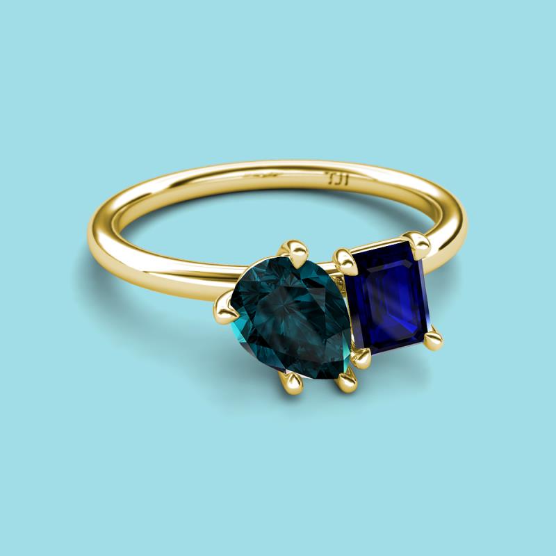Find a beautiful symbol of everlasting love, with our new collection of duo two-stone ring. A pair of Pear Shape London Blue Topaz shimmering alongside of a luminous Emerald Shape Blue Sapphire crafted beautifully is all set to represent two of you together.