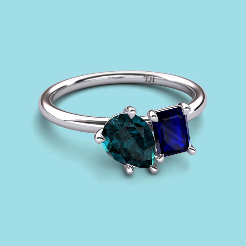 Find a beautiful symbol of everlasting love, with our new collection of duo two-stone ring. A pair of Pear Shape London Blue Topaz shimmering alongside of a luminous Emerald Shape Blue Sapphire crafted beautifully is all set to represent two of you together.