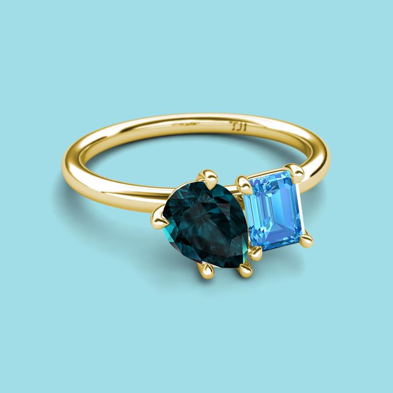 Find a beautiful symbol of everlasting love, with our new collection of duo two-stone ring. A pair of Pear Shape London Blue Topaz shimmering alongside of a luminous Emerald Shape Blue Topaz crafted beautifully is all set to represent two of you together.