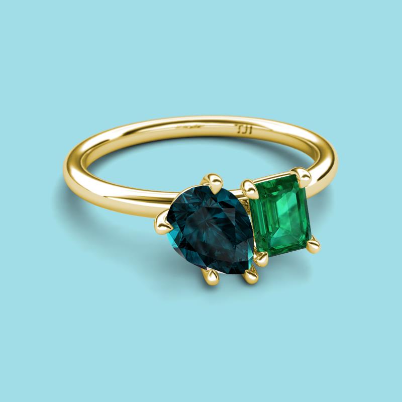 Find a beautiful symbol of everlasting love, with our new collection of duo two-stone ring. A pair of Pear Shape London Blue Topaz shimmering alongside of a luminous Emerald Shape Emerald crafted beautifully is all set to represent two of you together.