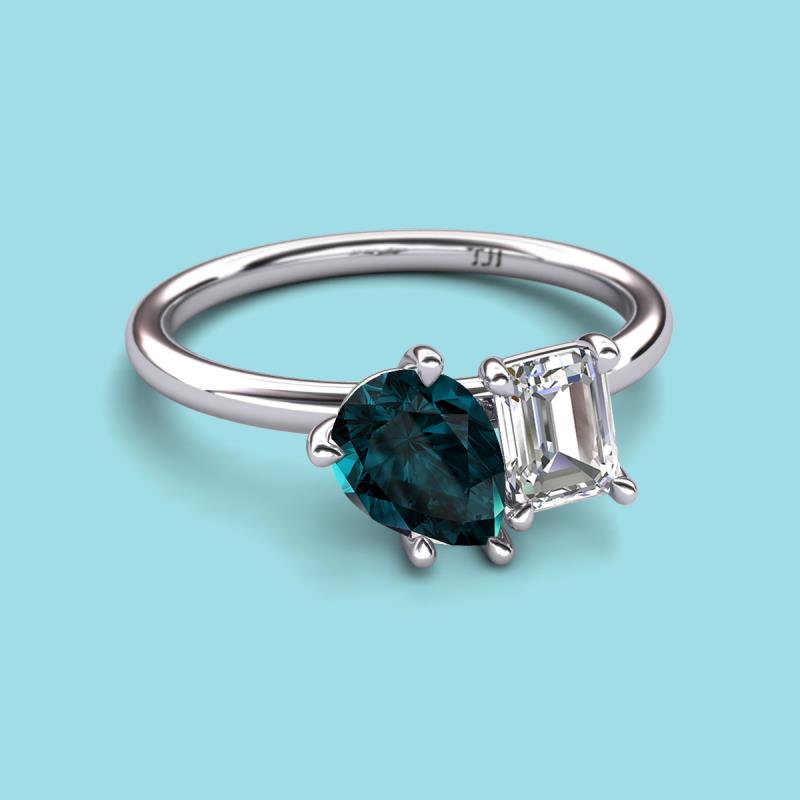 Find a beautiful symbol of everlasting love, with our new collection of duo two-stone ring. A pair of Pear Shape London Blue Topaz shimmering alongside of a luminous Emerald Shape GIA Certified Diamond crafted beautifully is all set to represent two of you together.