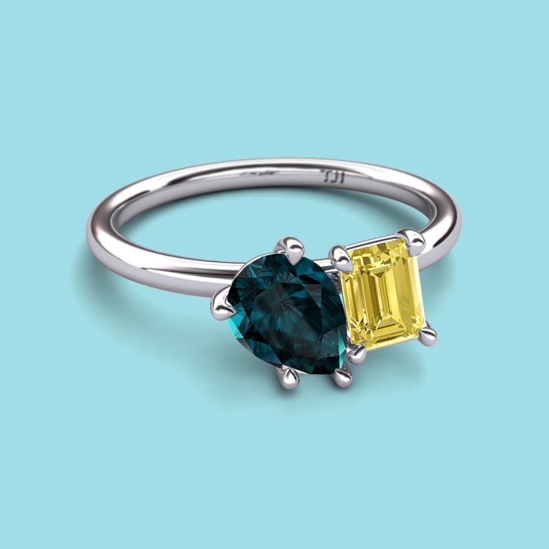 Find a beautiful symbol of everlasting love, with our new collection of duo two-stone ring. A pair of Pear Shape London Blue Topaz shimmering alongside of a luminous Emerald Shape Yellow Sapphire crafted beautifully is all set to represent two of you together.