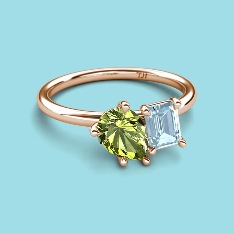 Find a beautiful symbol of everlasting love, with our new collection of duo two-stone ring. A pair of Pear Shape Peridot shimmering alongside of a luminous Emerald Shape Aquamarine crafted beautifully is all set to represent two of you together.