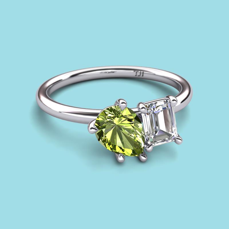 Find a beautiful symbol of everlasting love, with our new collection of duo two-stone ring. A pair of Pear Shape Peridot shimmering alongside of a luminous Emerald Shape IGI Certified Lab Grown Diamond crafted beautifully is all set to represent two of you together.