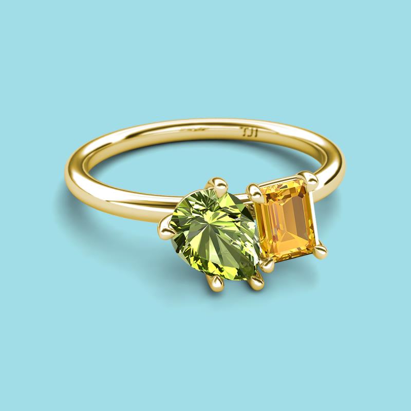 Find a beautiful symbol of everlasting love, with our new collection of duo two-stone ring. A pair of Pear Shape Peridot shimmering alongside of a luminous Emerald Shape Citrine crafted beautifully is all set to represent two of you together.