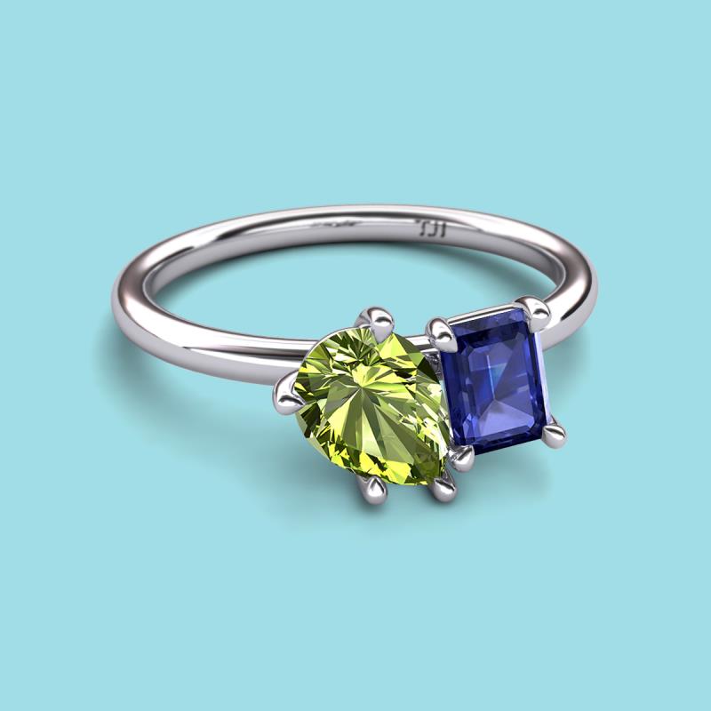 Find a beautiful symbol of everlasting love, with our new collection of duo two-stone ring. A pair of Pear Shape Peridot shimmering alongside of a luminous Emerald Shape Iolite crafted beautifully is all set to represent two of you together.