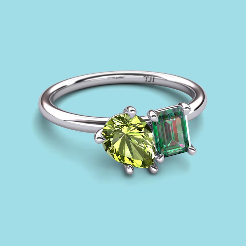 Find a beautiful symbol of everlasting love, with our new collection of duo two-stone ring. A pair of Pear Shape Peridot shimmering alongside of a luminous Emerald Shape Lab Created Alexandrite crafted beautifully is all set to represent two of you together.