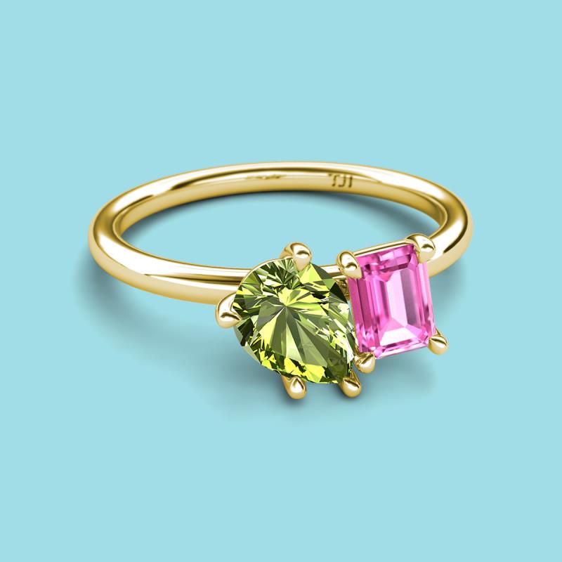 Find a beautiful symbol of everlasting love, with our new collection of duo two-stone ring. A pair of Pear Shape Peridot shimmering alongside of a luminous Emerald Shape Pink Sapphire crafted beautifully is all set to represent two of you together.