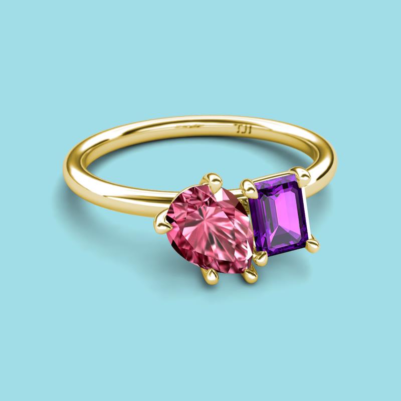 Find a beautiful symbol of everlasting love, with our new collection of duo two-stone ring. A pair of Pear Shape Pink Tourmaline shimmering alongside of a luminous Emerald Shape Amethyst crafted beautifully is all set to represent two of you together.