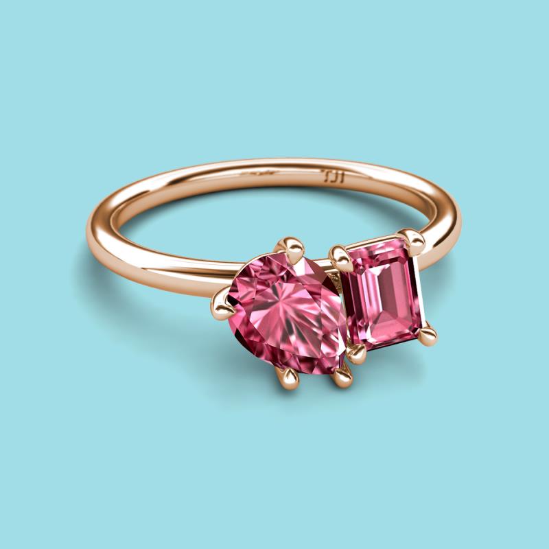 Find a beautiful symbol of everlasting love, with our new collection of duo two-stone ring. A pair of Pear Shape Pink Tourmaline shimmering alongside of a luminous Emerald Shape Amethyst crafted beautifully is all set to represent two of you together.