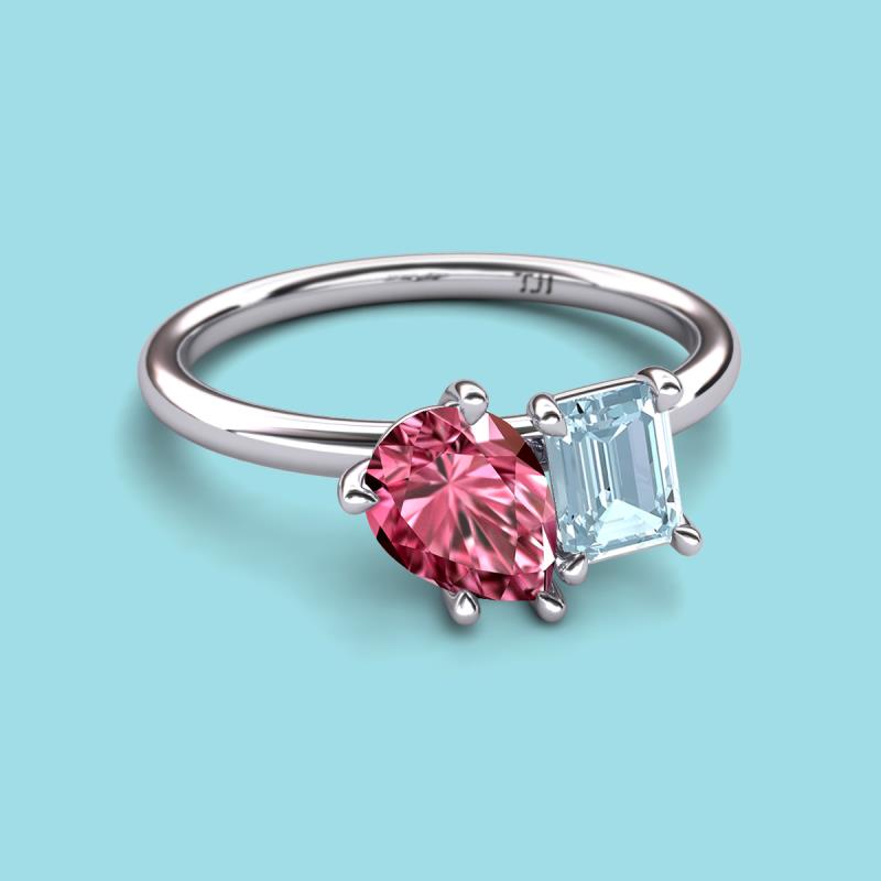 Find a beautiful symbol of everlasting love, with our new collection of duo two-stone ring. A pair of Pear Shape Pink Tourmaline shimmering alongside of a luminous Emerald Shape Aquamarine crafted beautifully is all set to represent two of you together.