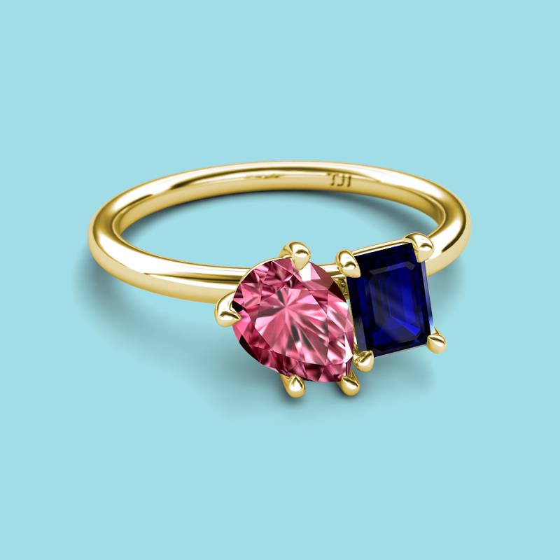 Find a beautiful symbol of everlasting love, with our new collection of duo two-stone ring. A pair of Pear Shape Pink Tourmaline shimmering alongside of a luminous Emerald Shape Blue Sapphire crafted beautifully is all set to represent two of you together.